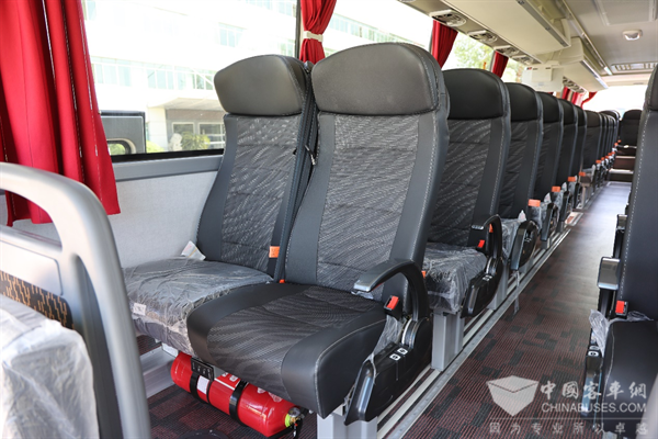 车内座椅为55+1+1的布局共57座。海格新V系的座椅坐垫填充厚实,坐垫长度长,支持横向拓宽,对大体格的乘客非常友好。座椅也采用的是环保面料,皮革+织物双拼面,车内暴晒无异味,坐感柔软舒适。