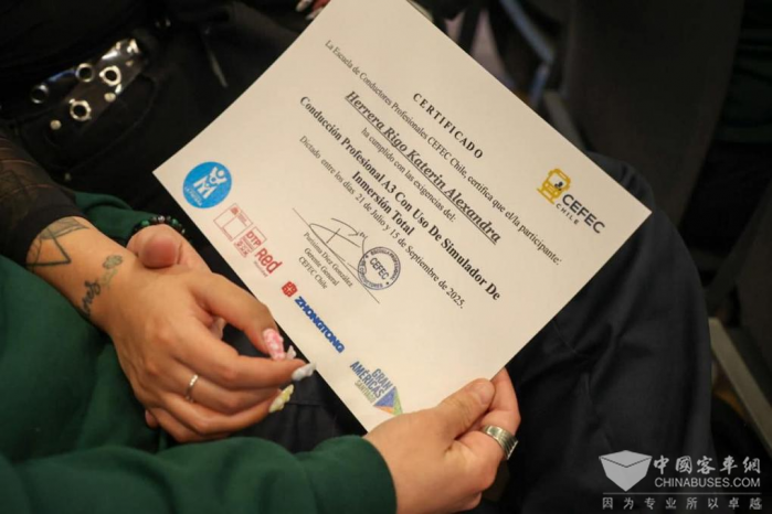 为促进智利圣地亚哥大区性别平等与就业公平,推动绿色交通发展和相关人才培养,当地时间2025年11月14日,由山东重工集团中通客车赞助支持的智利女驾驶员人才培养计划圆满结项。当天,结项证书颁发仪式在智利首都圣地亚哥隆重举行。