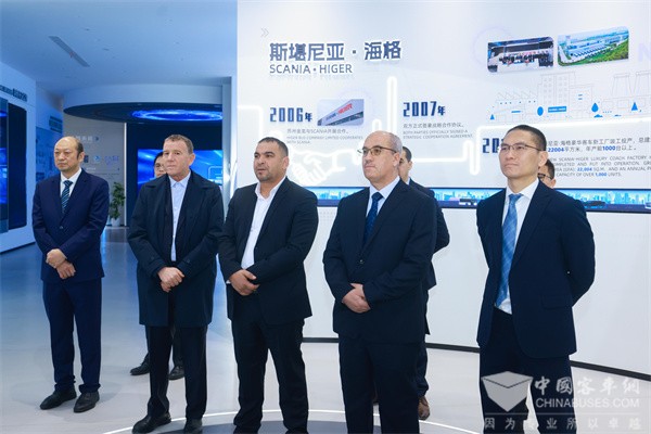 苏州金龙副总经理郑春辉(右一)、海外销售总经理姜海峰(左一)陪同阿方代表参观展厅
