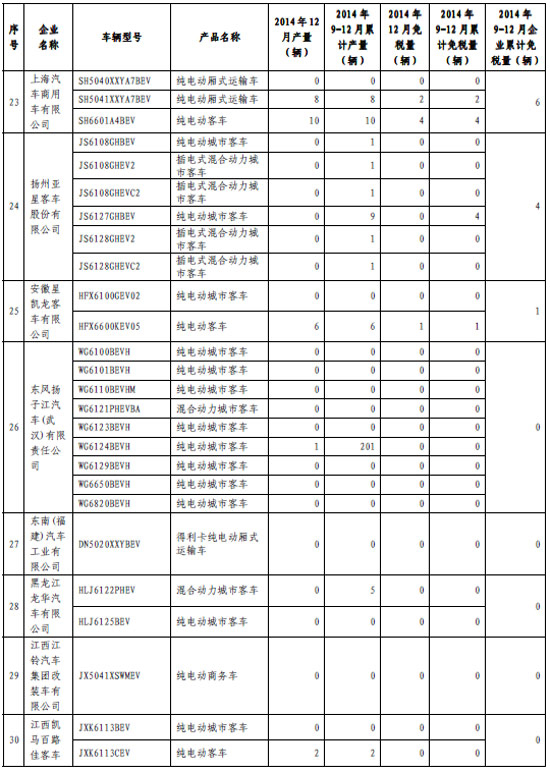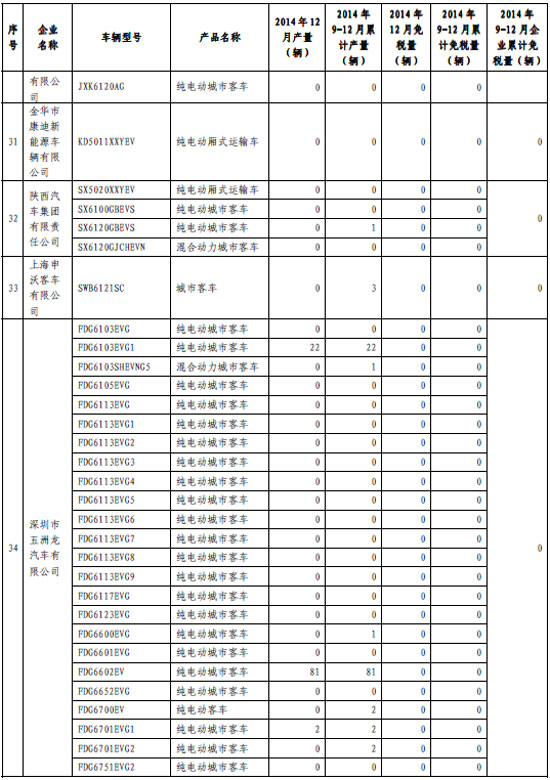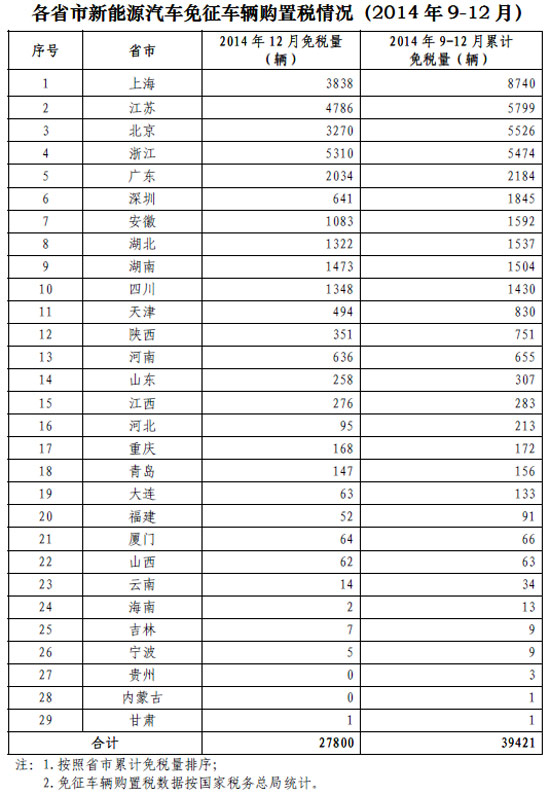 据国家税务总局统计,2014年9月-12月有29个省市有办理新能源汽车免征车购税手续,共免征车购税新能源汽车3.94万辆,其中乘用车3.38万辆,商用车5615辆。