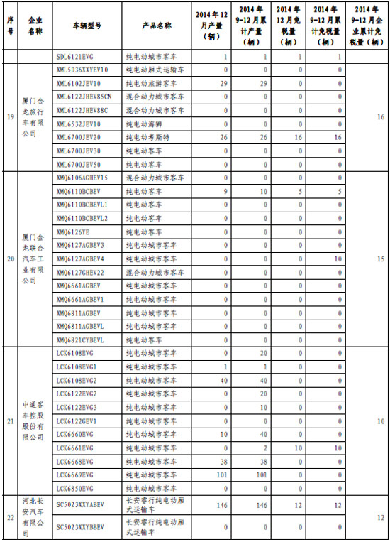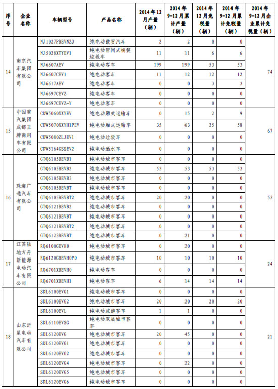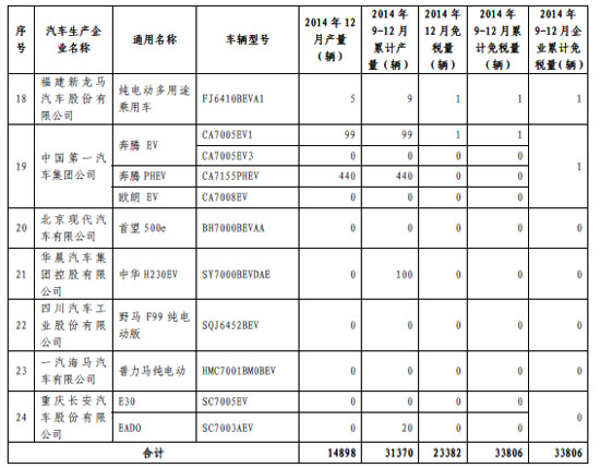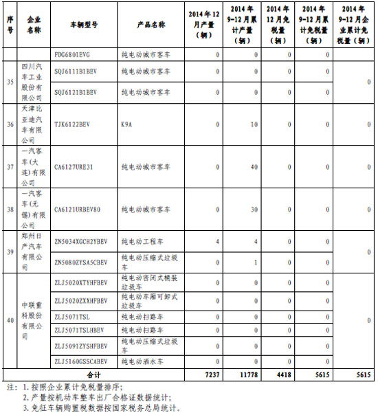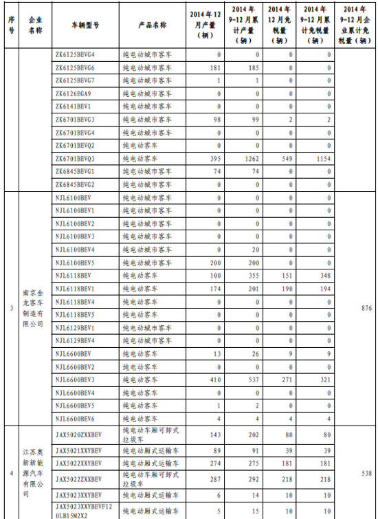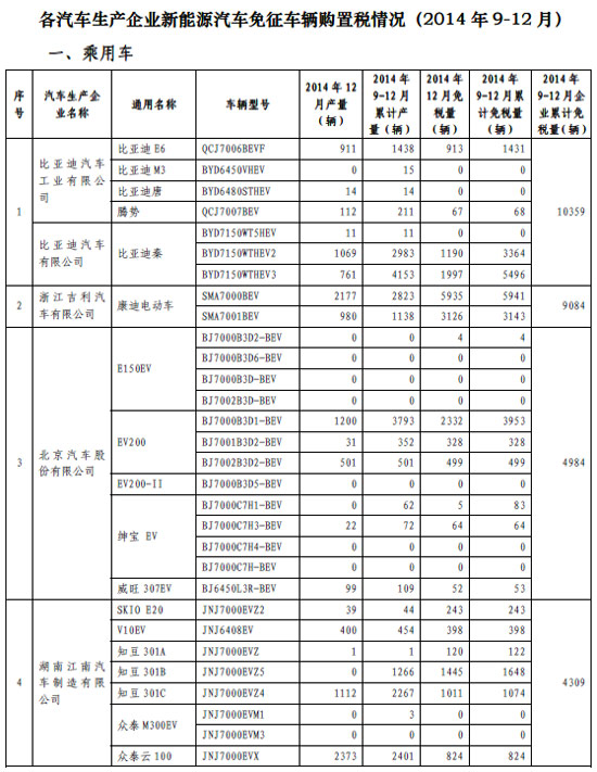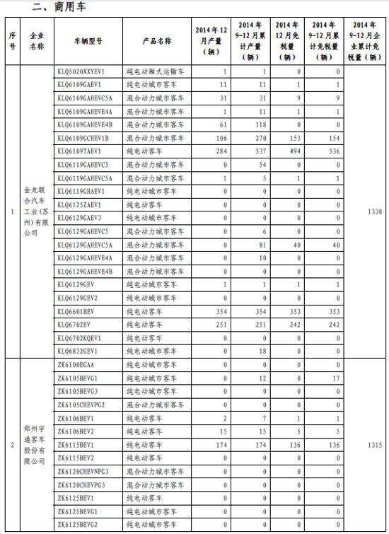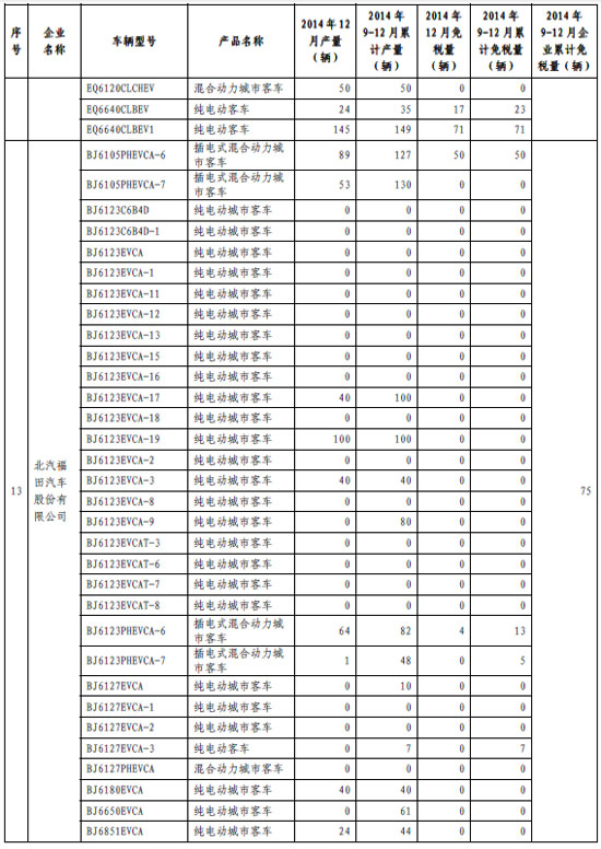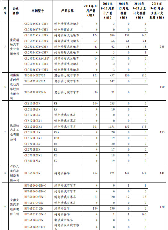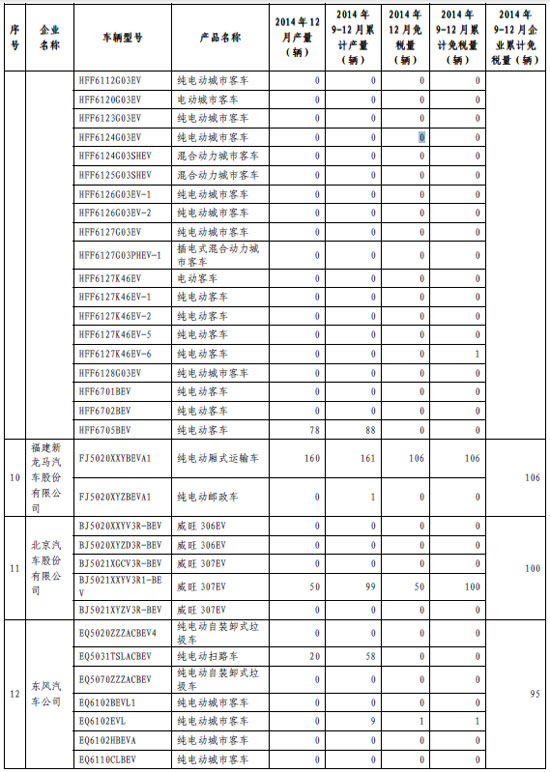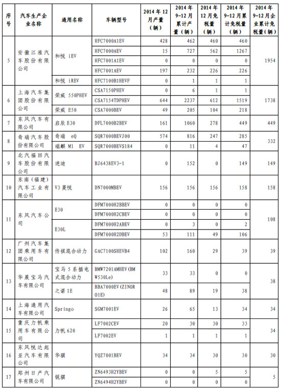 2015年2月5日,工信部发布“2014年9月-12月新能源汽车免征车辆购置税情况”:国务院常务会议审议决定,自2014年9月1日至2017年底,对获得许可在中国境内销售(包括进口)的纯电动以及符合条件的插电式(含增程式)混合动力、燃料电池三类新能源汽车,免征车辆购置税。截至2014年底,工业和信息化部、国家税务总局已发布三批免征车购税的车型目录,有57家企业的377款车型列入目录。
