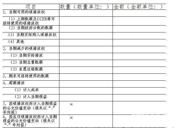 注:除“因碳排放权而计入当期损益的公允价值变动”项目外,上表中的金额栏应当以资产负债表日碳排放权公允价值计量的金额列报。