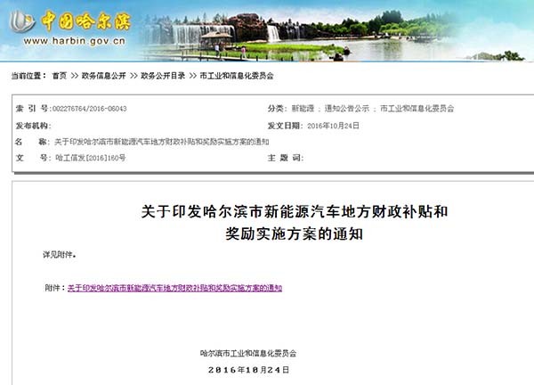 2016年10月27日,完美作业网有免费视频从哈尔滨市工业和信息化委员会获悉,哈尔滨市印发《哈尔滨市新能源汽车地方财政补贴和奖励实施方案》,规定补贴标准为,按照国家补贴标准,对纯电动汽车按1:1、插电式混合动力汽车按1:0.8的比例给予地方财政补贴。2017-2018年,补贴标准以2016年为基数不退坡。各级财政补贴总额最高不超过车辆销售价格的60%。原文详见附件。