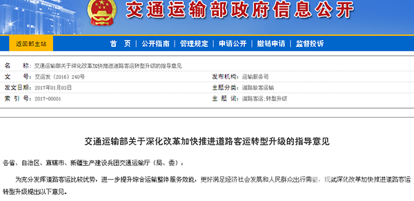 2017年1月3日,交通运输部运输服务司发布关于深化改革加快推进道路客运转型升级的指导意见,其中提到:扩大道路客运企业经营自主权。对于成立线路公司的道路客运班线或者实行区域经营的,由道路客运企业在保证基本服务标准的前提下,自主确定道路客运班线运力投放(含新增、更新和调配运力)、班次增减(含加班车)和途经站点,报原许可机关备案,并提前向社会公布。对于变更道路客运班线起讫地内相关起讫站点的,由道路客运企业和有关客运场站协商一致后,报原许可机关备案。