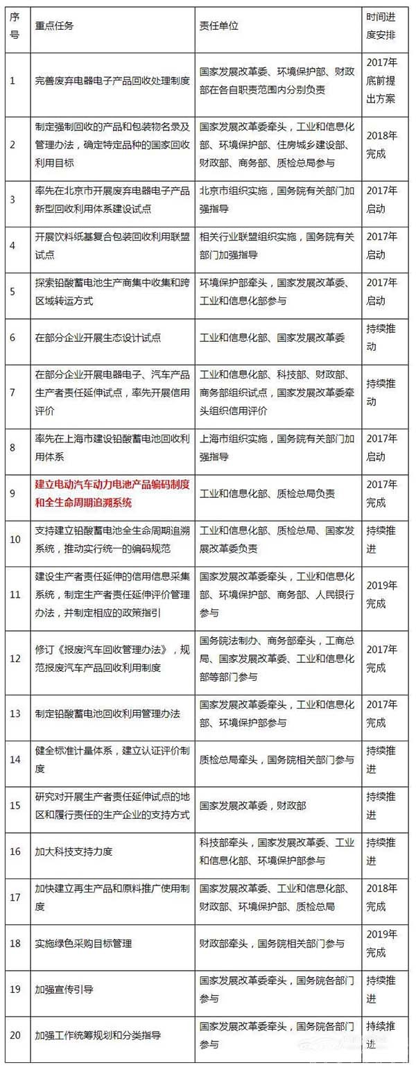 “建立电动汽车动力电池产品编码制度和全生命周期追溯系统”被列为重点任务,该项任务由工业和信息化部、质检总局负责,计划于2017年完成。