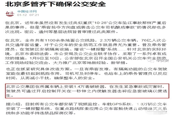 消息一出,全国各主要省市公交系统积极相应、及时作为,在完善原有安防措施的同时纷纷打出“人防+技防”组合拳,通过自动破玻器、灭火器、隔离门、安全员、报警系统等多种方式,尽可能保障公交行车安全。