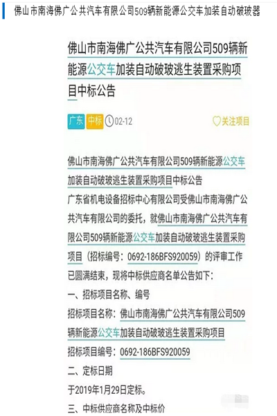 佛山市南海佛广公共汽车有限公司509辆新能源公交车加装自动破玻器
