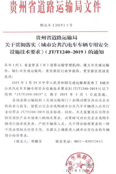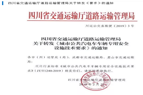 2019年1月底,交通运输部关于发布交通运输行业标准《城市公共汽电车车辆专用安全设施技术要求》的公告(以下简称《要求》),对城市公共汽电车车辆专用安全设施的乘客门、应急出口、破窗装置、驾驶区防护隔离设施、车用灭火装置、电池舱自动灭火装置、电池箱灭火装置、易燃挥发物监测报警装置、轮胎压力监测系统等技术提出了要求,并于2019年3月1日起正式实施。