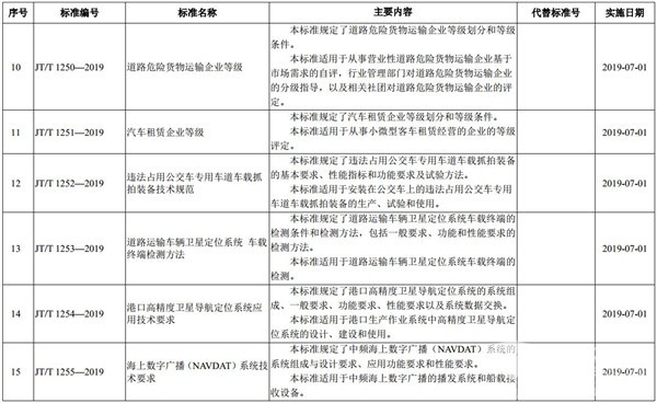 2019年03月18日,交通运输部发布了《城市公共汽电车驾驶区防护隔离设施技术要求》等35项交通运输行业标准(2019年第3批),具体内容如下: