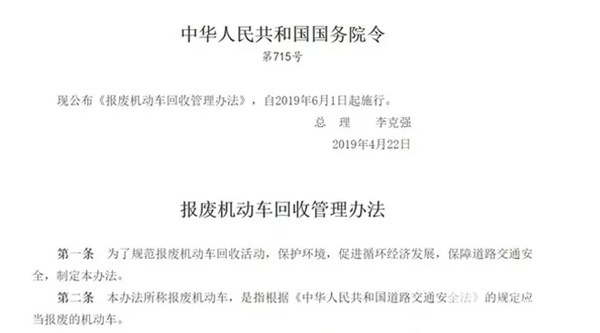 2019年5月6日,国务院发布第715号国务院令宣布,《报废机动车回收管理办法》自2019年6月1日期实施,这意味着已经施行18年之久的《报废汽车回收管理办法》将在本月底废止。办法规定,国家对报废机动车回收企业实行资质认定制度。未经资质认定,任何单位或者个人不得从事报废机动车回收活动;国家鼓励机动车生产企业从事报废机动车回收活动。