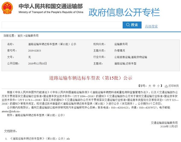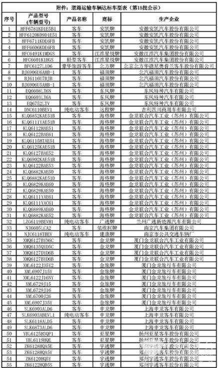 2019年12月3日,交通运输部公示了道路运输车辆达标车型表(第15批),本批达标车型共包括客车95款,其中包括6款纯电动客车。