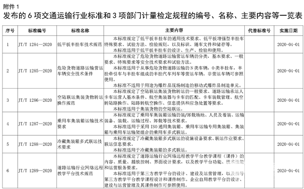 《低平板半挂车技术规范》等6项交通运输行业标准、《磁通量索力检测仪》等3项部门计量检定规程(2020年第1批,见附件1),以及《营运客车类型划分及等级评定》(JT/T 325-2018)第1号修改单(见附件2)业经审查通过,现予发布。发布的标准和规程均为推荐性标准。以上标准、计量检定规程和标准修改单由人民交通出版社有限公司出版,并在交通运输部官方网站公布。