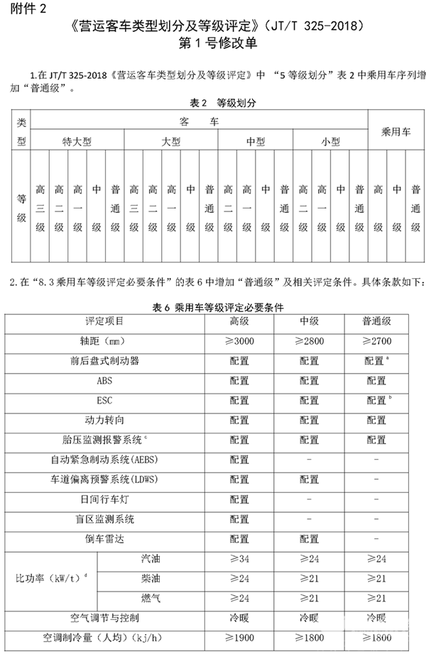 2.《营运客车类型划分及等级评定》(JT/T 325-2018)第1号修改单