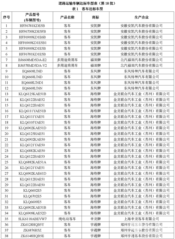 根据《中华人民共和国节约能源法》《中华人民共和国道路运输条例》《道路运输车辆燃料消耗量检测和监督管理办法》,以及《交通运输部办公厅关于贯彻落实习近平总书记重要指示批示精神切实加强道路运输安全监管工作的通知》《交通运输部办公厅关于贯彻落实交通运输行业标准<营运客车安全技术条件>(JT/T 1094—2016)的通知》《交通运输部办公厅关于做好交通运输行业标准<营运货车安全技术条件>(JT/T 1178.1—2018)落实工作的通知》《交通运输部办公厅关于贯彻落实交通运输行业标准<营运客车类型划分及等级评定>(JT/T 325—2018)的通知》等有关规定,第18批道路运输车辆达标车型已通过技术审查和公示,现予以发布。