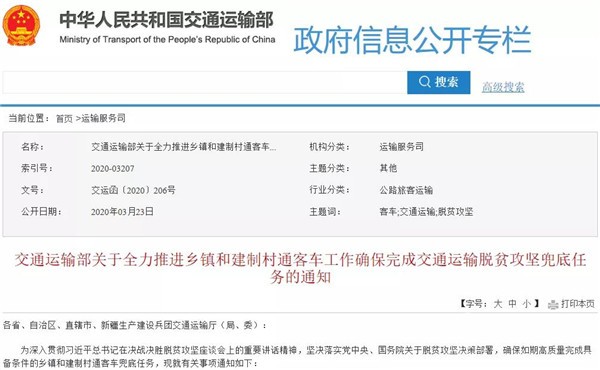 2020年3月23日,交通运输部发布了《关于全力推进乡镇和建制村通客车工作确保完成交通运输脱贫攻坚兜底任务》的通知。