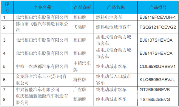 其中8款新能源客车中, 纯电动客车有4款,燃料电池动力和插电式混合动力客车各有两款。