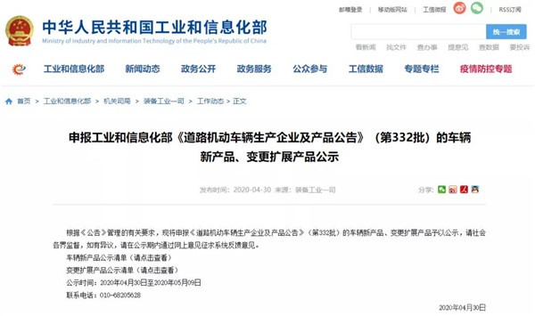 第332批《道路机动车辆生产企业及产品公告》新车公示: