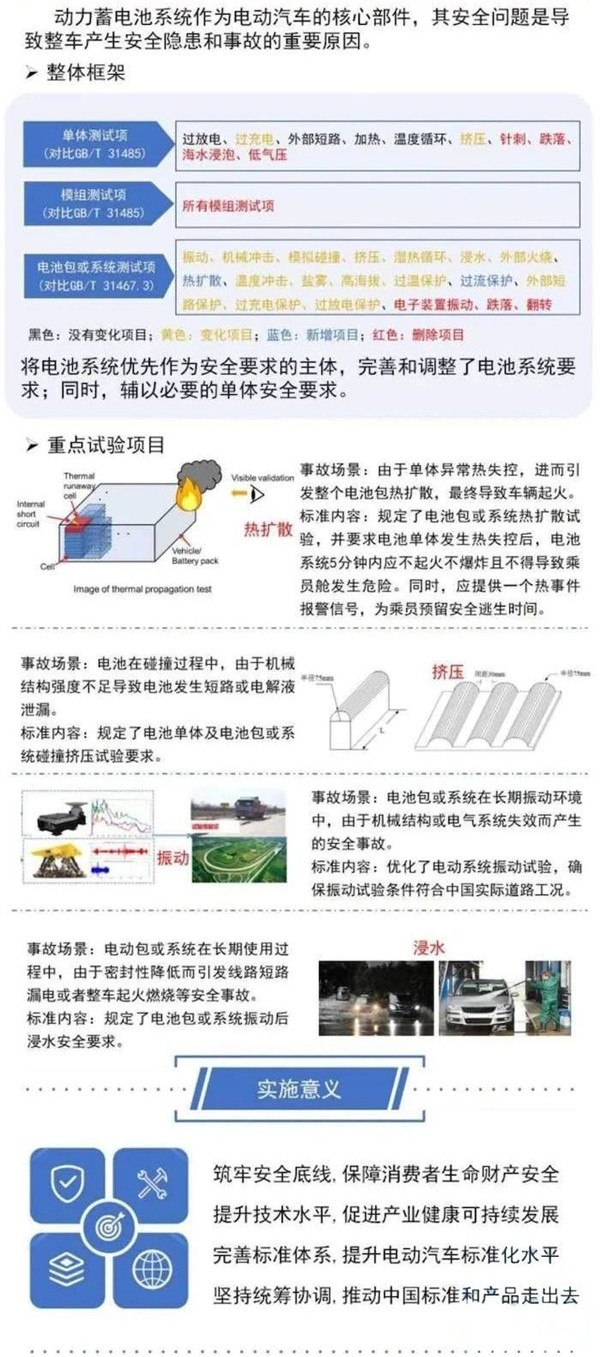 《电动汽车用动力蓄电池安全要求》在优化电池单体、模组安全要求的同时,重点强化了电池系统热安全、机械安全、电气安全以及功能安全要求,试验项目涵盖系统热扩散、外部火烧、机械冲击、模拟碰撞、湿热循环、振动泡水、外部短路、过温过充等。特别是标准增加了电池系统热扩散试验,要求电池单体发生热失控后,电池系统在5分钟内不起火不爆炸,为乘员预留安全逃生时间。