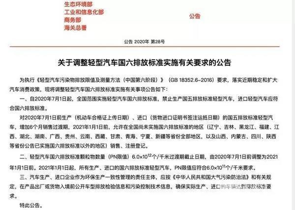 此外,轻型汽车国六排放标准颗粒物数量(PN限值)6.0×1012个/千米过渡期截止日期,由2020年7月1日前调整为2021年1月1日前。2021年1月1日起,所有生产、进口的国六排放标准轻型汽车,PN限值应符合6.0×1011个/千米要求。