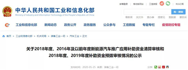 工信部公示2018、2019年度新能源车补贴清算及预拨审核情况
