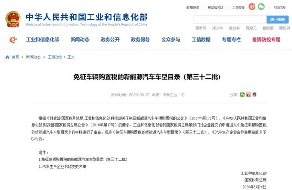 2020年6月2日,工信部发布了《免征车辆购置税的新能源汽车车型目录(第三十二批)》,本批次《目录》包含283款车型,其中含乘用车52款(纯电动乘用车49款,插电式混合动力乘用车3款);同时公告了《汽车生产企业名称变更名单》。值得注意的是,本批次共有103款新能源客车入选,其中,纯电动车型99款、插电式混合动力车型和燃料电池车型各2款。原文如下:
