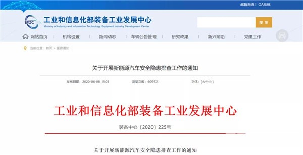 2020年6月8日,工信部装备工业发展中心发布《关于开展新能源汽车安全隐患排查工作的通知》,要求新能源汽车生产企业及动力电池供应商对生产的新能源汽车开展安全隐患排查工作,新能源汽车生产企业应当于2020年10月底前完成新能源汽车安全隐患排查工作,形成书面报告。