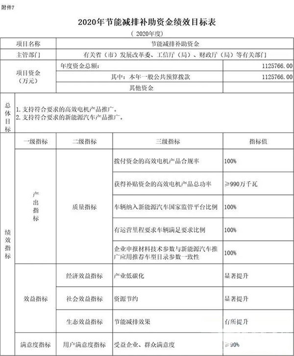 根据《关于开展“节能产品惠民工程”的通知》(财建〔2009〕213号)、《关于印发<节能产品惠民工程高效电机推广实施细则>的通知》(财建〔2010〕232号)、《关于做好高效电机推广补贴清算工作的通知》(财建〔2017〕6号)、《关于2016-2020年新能源汽车推广应用财政支持政策的通知》(财建〔2015〕134号)、《关于调整新能源汽车推广应用财政补贴政策的通知》(财建〔2016〕958号)、《关于调整完善新能源汽车推广应用财政补贴政策的通知》(财建〔2018〕18号)、《关于进一步完善新能源汽车推广应用财政补贴政策的通知》(财建〔2019〕138号)、《关于完善新能源汽车推广应用财政补贴政策的通知》(财建〔2020〕86号)等文件有关规定,现下达你省(区、市)节能减排补助资金(具体见附件),用于高效电机推广补贴、2015-2018年度新能源汽车购置补贴清算、新能源汽车购置补贴预拨。