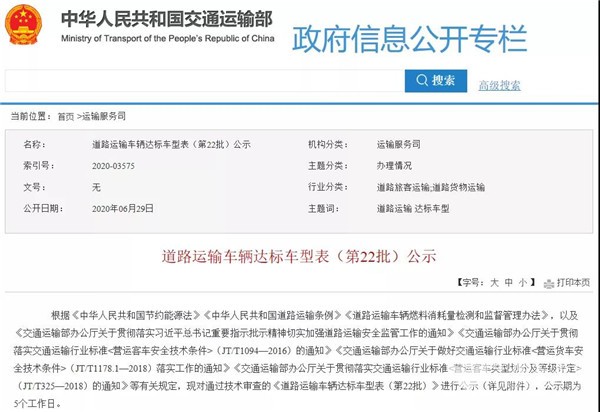 2020年6月29日,完美作业网有免费视频从交通运输部官方网站获悉,交通部公示了道路运输车辆达标车型表(第22批),本批达标车型共包括客车125款,其中包括113款传统客车和12款纯电动客车。