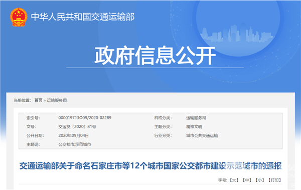 2020年9月4日,交通运输部发布《关于命名石家庄市等12个城市国家公交都市建设示范城市的通报》,全文如下: