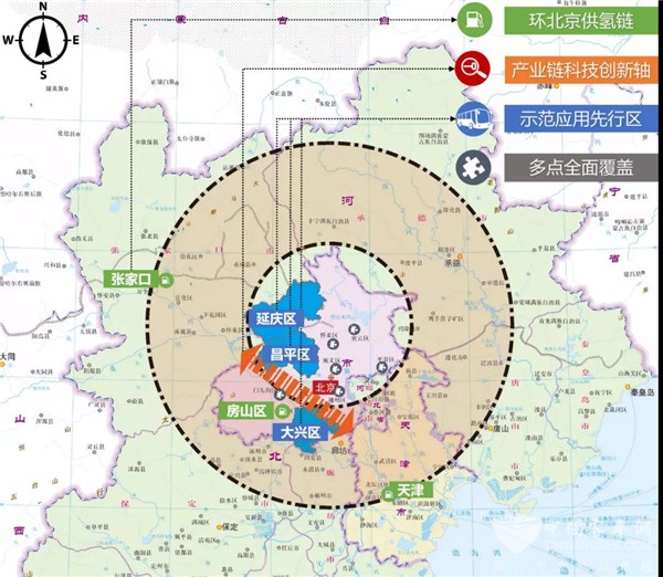 《规划》明确构建“一环一轴两区多点”的氢燃料电池汽车产业布局新形态,“一环”是环北京供氢链,立足房山区丰富的氢能制取优势,充分开发河北省张家口市、天津市等区域氢源供应互补能力,多渠道强化氢源保障,构建环北京供氢链;“一轴”是产业链科技创新轴,构建沿海淀区—北京经济技术开发区的全国领先的氢能产业核心技术创新轴,以科技研发带动产业化落地;“两区”是示范应用先行区,北部区域为延庆区与昌平区,分别借助冬奥会契机和车辆高端制造和应用示范基地,开展氢燃料汽车示范应用。南部区域为大兴区,依托中国(河北)自由贸易试验区大兴片区,集合大兴国际机场和货运物流集散中心优势,在机场巴士、货运物流等领域推广应用氢燃料电池汽车;“多点”为多点全面覆盖,立足一环一轴两区的发展成果,逐步拓宽氢燃料电池汽车推广运行区域,形成以北京市为核心辐射津冀的市场联动发展态势。