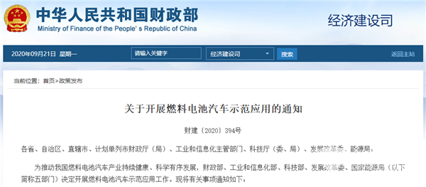 近日,财政部、工业和信息化部、科技部、发展改革委、国家能源局(以下简称“五部门”)联合发布了《关于开展燃料电池汽车示范应用的通知》(财建〔2020〕394号,以下简称《通知》)。现就文件出台的背景、总体思路、主要内容等相关事项解读如下: