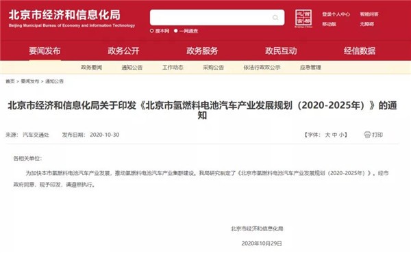 2020年10月30日,北京市经济和信息化局发布《北京市氢燃料电池汽车产业发展规划(2020-2025年)》。
