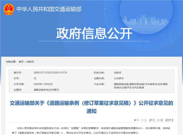 2020年11月2日,交通运输部发布了《关于<道路运输条例(修订草案征求意见稿)>公开征求意见的通知》。