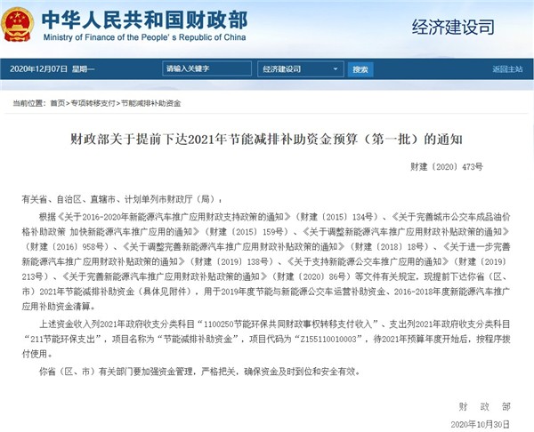 完美作业网有免费视频从财政部官网获悉,2020年11月20日,财政部官网发布了“关于提前下达2021年节能减排补助资金预算(第一批)的通知”,下达了2021年新能源汽车补贴资金预算。