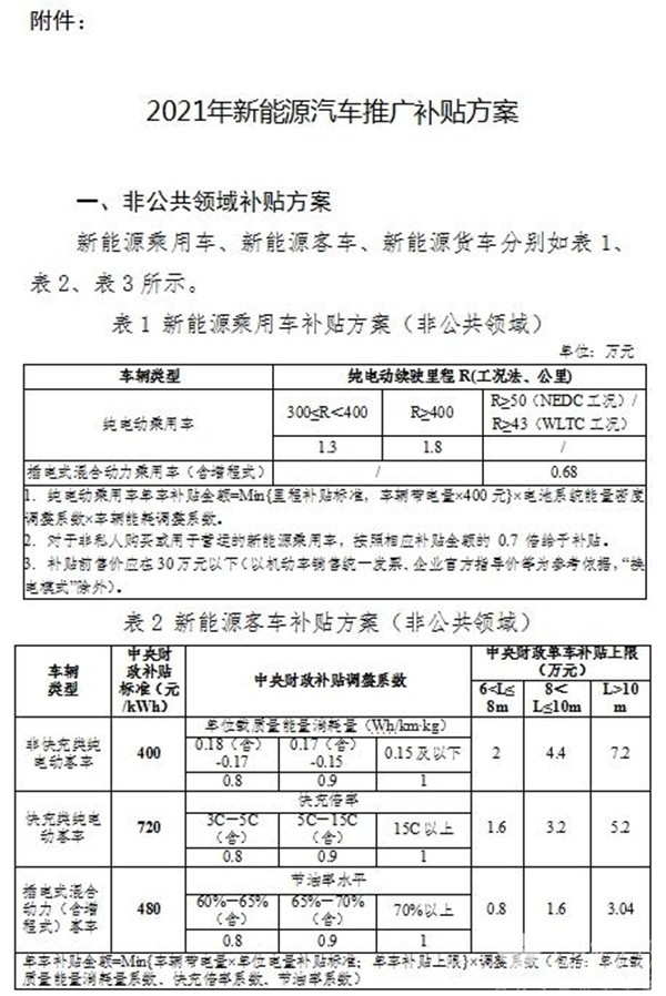 按照财建〔2020〕86号文件规定,2021年新能源汽车购置补贴标准在2020年基础上退坡20%;为加快公共交通等领域汽车电动化,城市公交、道路客运、出租(含网约车)、环卫、城市物流配送、邮政快递、民航机场以及党政机关公务领域符合要求的新能源汽车,2021年补贴标准在2020年基础上退坡10%。按此,《通知》明确了不同类型、不同领域车辆产品的补贴标准,为补贴政策精准执行提供依据。考虑到有关退坡比例已通过财建〔2020〕86号文件提前发布,上述标准从2021年1月1日起执行。