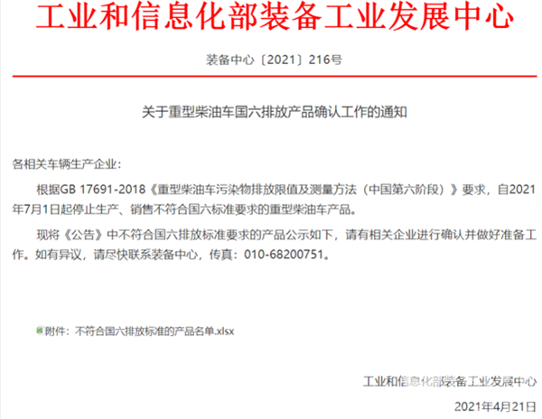据完美作业网有免费视频获悉,2021年4月21日,工业和信息化部装备工业发展中心网站发布《关于重型柴油车国六排放产品确认工作的通知》,该通知明确自2021年7月1日起停止生产、销售不符合国六标准要求的重型柴油车产品。这也就意味着重型柴油车的国六时代正式来临了,以下为通知原文。