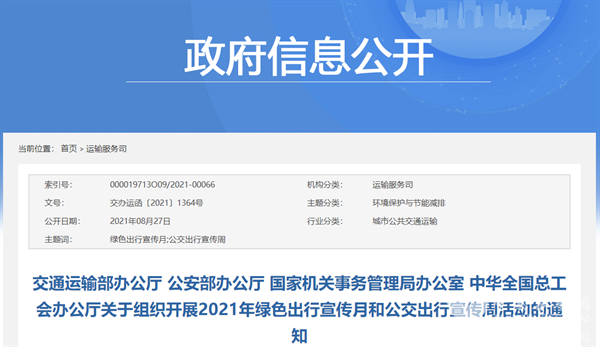 据交通运输部官网消息,按照《交通运输部等十二部门和单位关于印发<绿色出行行动计划(2019—2022年)>的通知》(交运发〔2019〕70号)等有关安排,经交通运输部、公安部、国家机关事务管理局、中华全国总工会同意,决定于2021年9月组织开展2021年绿色出行宣传月和公交出行宣传周活动。