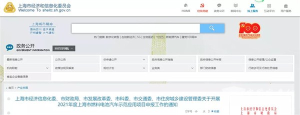 2021年12月8日,上海市经济信息化委、市财政局、市发展改革委、市科委、市交通委、市住房城乡建设管理委印发了《关于开展2021年度上海市燃料电池汽车示范应用项目申报工作的通知》。
