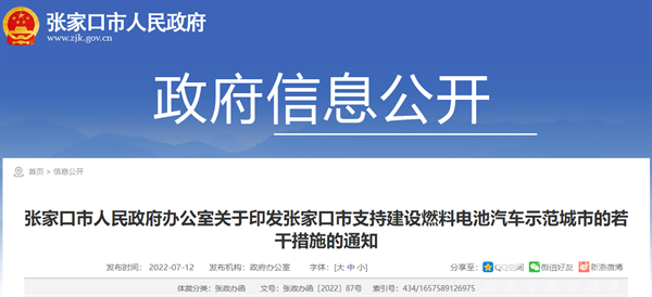 2022年7月12日,为抢抓我张家口市创建国家燃料电池汽车示范应用城市机遇,加快推动张家口市氢能高质量发展,张家口市人民政府办公室印发关于《张家口市支持建设燃料电池汽车示范城市的若干措施》 的通知。