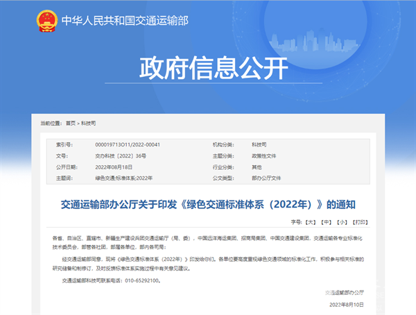 2022年8月18日,交通运输部办公厅发布了《绿色交通标准体系(2022年)》的通知。
