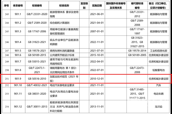 《标准体系》涉及新能源与清洁能源应用、能耗能效、碳排放控制、节能技术与管理等多项节能降碳标准,在氢能和燃料电池方面,节能降碳标准200中包括燃料电池客车技术规范、氢燃料电池公共汽车配置要求,国家节能降碳相关标准中包括:加氢站技术规范(2021年版)。