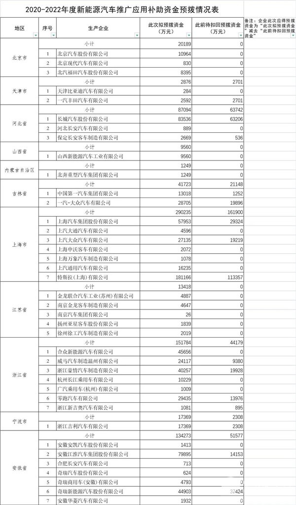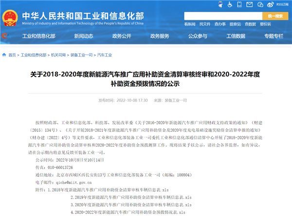 2022年10月8日,工业和信息化部装备工业一司委托工业和信息化部通信清算中心开展的2018-2020 年度新能源汽车推广应用补助资金清算审核和 2020-2022 年度补助资金预拨测算工作结果正式出炉,并在工信部官网进行公示。