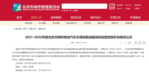 2023年7月24日,北京市城市管理委员会发布《2021-2022年度北京市燃料电池汽车车用加氢站建设和运营财政补贴情况公示》。