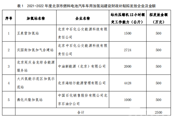 北京市:发布2021-2022年度加氢站补贴公示