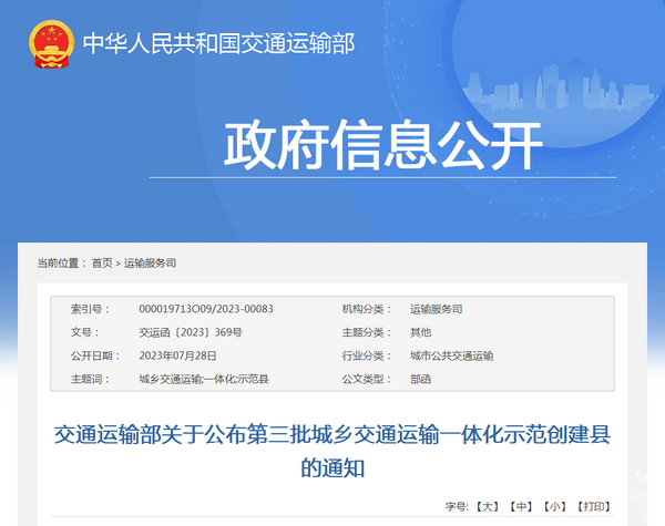 交通运输部:关于公布第三批城乡交通运输一体化示范创建县的通知