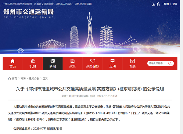2023年7月3日,郑州市交通运输局印发了关于《郑州市推进城市公共交通高质量发展实施方案》(征求意见稿) 。
