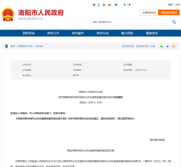 2023年7月6日 ,洛阳市人民政府印发了关于《洛阳市推动城市公共交通高质量发展实施方案》的通知(洛政办〔2023〕29号)。