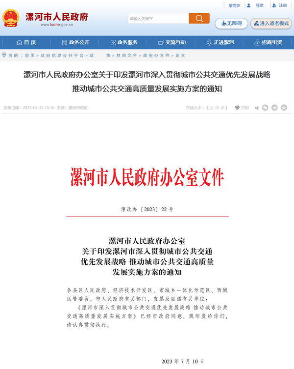 2023年7月10日,漯河市人民政府印发了漯河市《深入贯彻城市公共交通优先发展战略、推动城市公共交通高质量发展实施方案》的通知,(漯政办【2023】22号)。