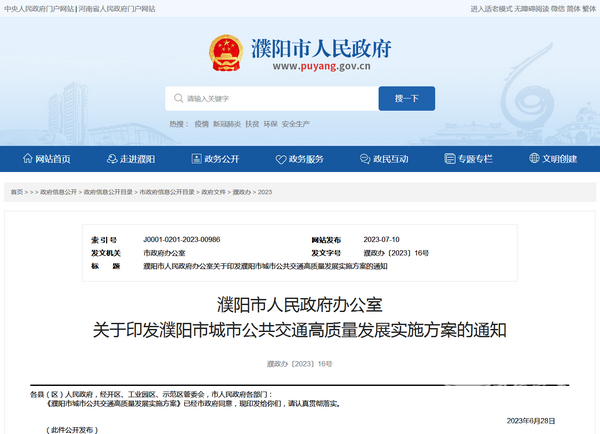 2023年6月28日 ,濮阳市人民政府印发了关于《濮阳市城市公共交通高质量发展实施方案》的通知(濮政办〔2023〕16号)。