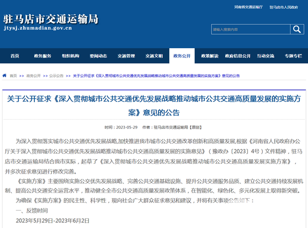 2023年5月29日,驻马店市交通运输局印发了关于公开征求《深入贯彻城市公共交通优先发展战略推动城市公共交通高质量发展的实施方案》意见的公告。